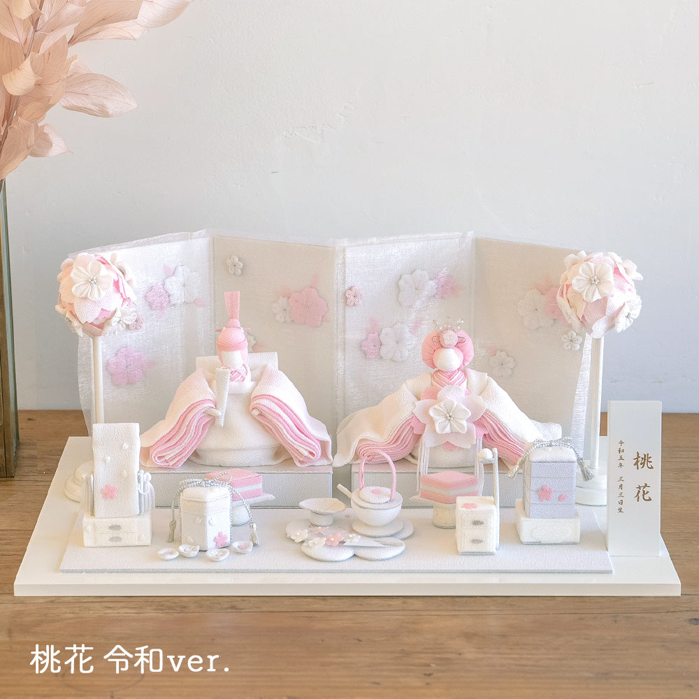 HAKIのちりめん雛人形『オリジナル雛揃 桃花(ももか)』は、白と桃色の組み合わせがかわいい雛人形です。